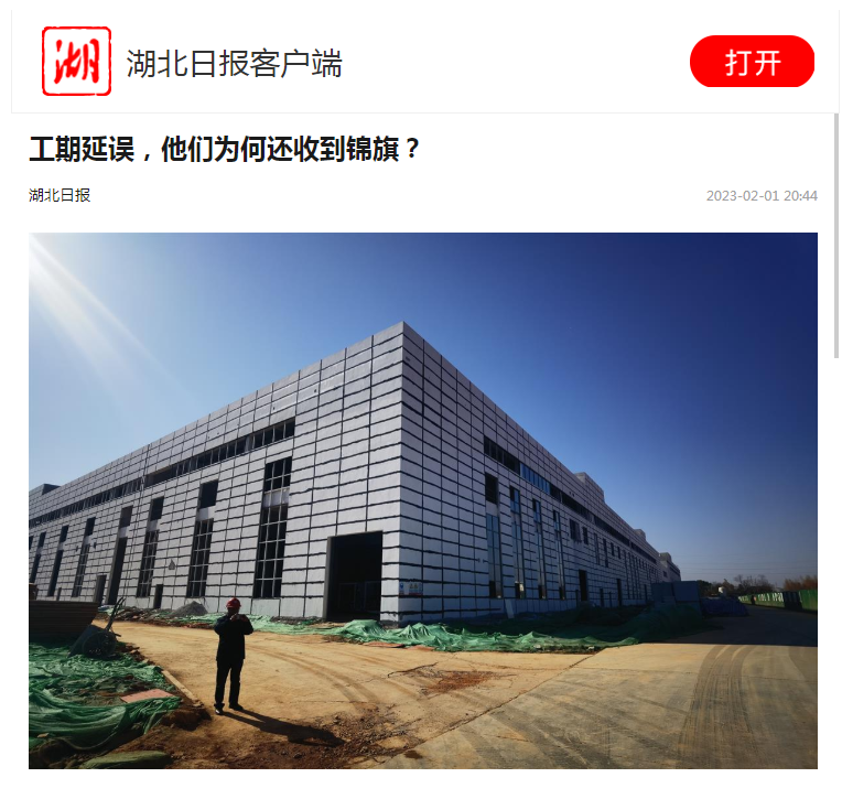 2月1日,湖北日报报道了由台湾av 承建的稳健医疗(嘉鱼)科技产业园一期项目收到“优秀项目团队”嘉奖锦旗背后的故事。