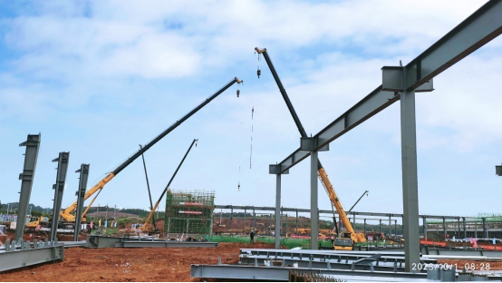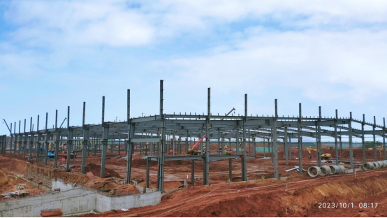 海关查验区共有独基及承台119个,完成119个,完成率100%;贴建办公楼部分已于10月5日全部封顶,钢结构总吨位530吨(含檩条),加工构件到场450吨,现场已安装420吨,完成率79.24%。